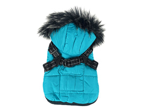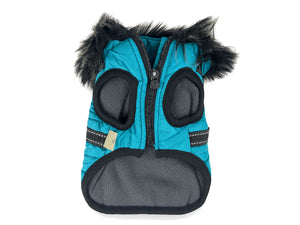 Blauer Wintermantel für Hunde mit Fellkapuze und integriertem Geschirr