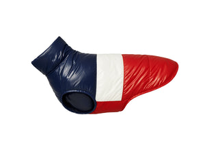 Made from lightweight yet extremely warm materials, it features a glossy finish and a tricolour design that recalls the chicest Parisian style.
